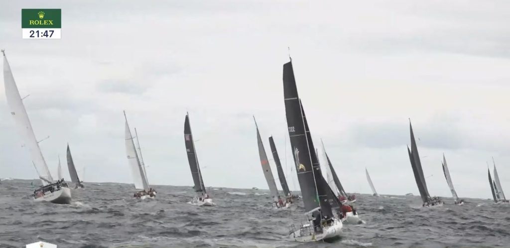 There are multiple start lines. Fourteen of the big boats started on the first start line. With smaller boats on second, third start lines. Most of the boats running with their head sail. Most of the boats started out on the west-hand side to take advantage of the wind.