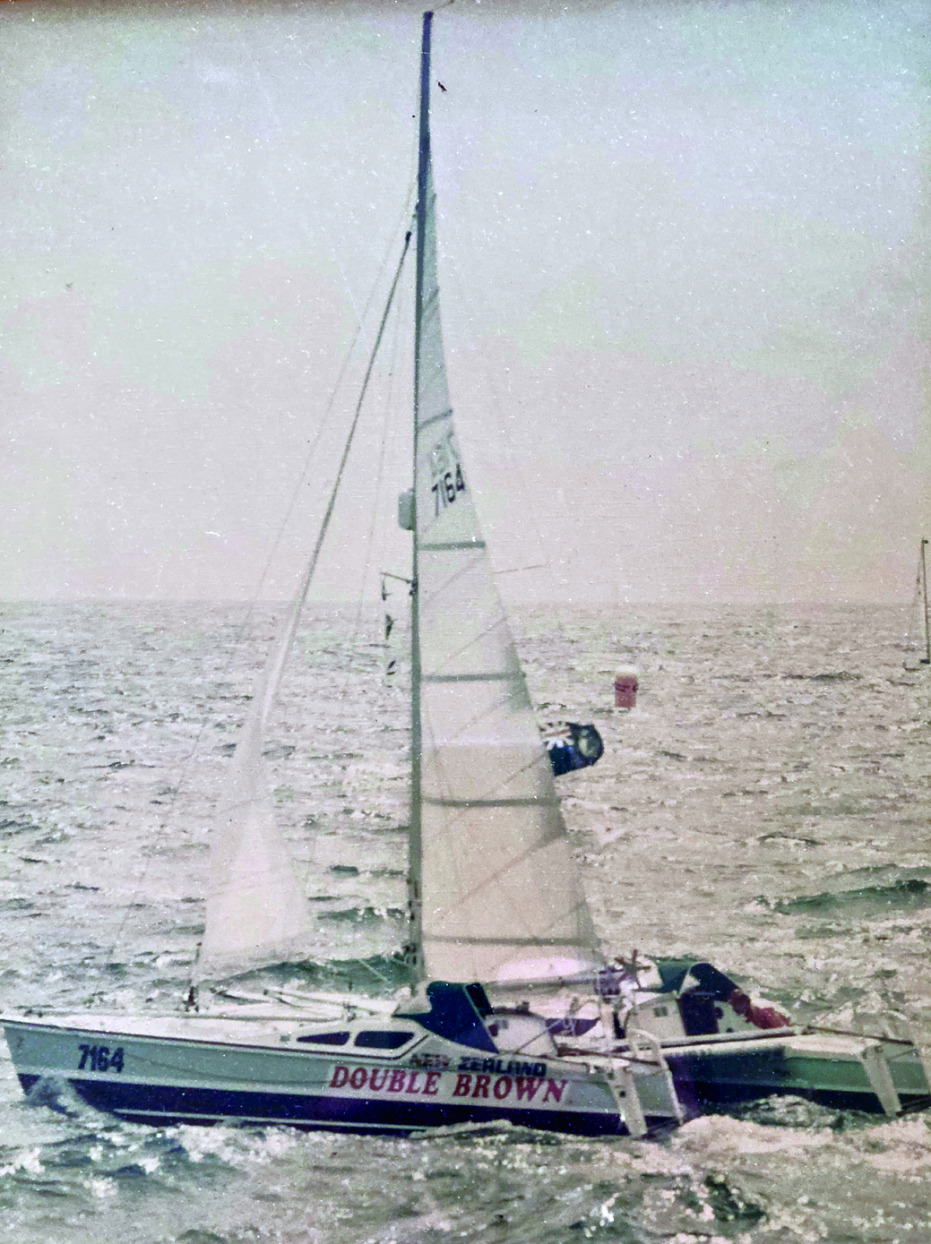 Once again, thanks to his shipping contacts, Mansell was able to have Double Brown shipped to England free of charge. Mansell had entered Class 4, under 10.66m, and after the first six days was leading the other 20 boats in the class. Unfortunately, Double Brown’s main halyard broke, and Mansell lost the spare he had rigged in Plymouth. He was forced to heave to and scale the mast at midnight to rig a replacement. During this time, Mansell discovered the inner gunwales of the hulls had developed cracks, and one of the bolts holding the main beam to a hull had worked loose.