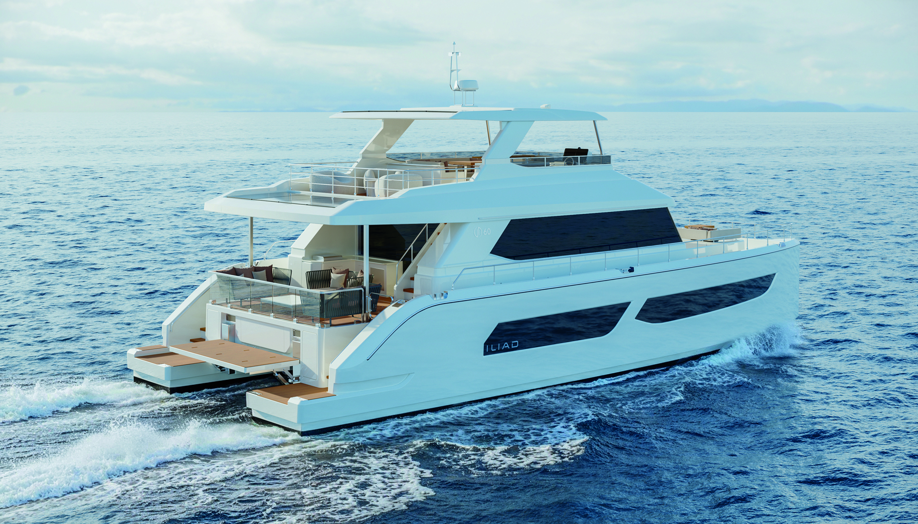 ILIAD Catamarans all new ILIAD 60 replaces the popular ILIAD 62. This next-generation design enhances offshore cruising with improved performance, efficiency, and refinement, while maintaining exceptional range and comfort. The ILIAD 60 offers remarkable fuel economy and a range exceeding 3,500 nautical miles. The main deck layout can be customised to suit each owner’s lifestyle, featuring a well-equipped galley and expansive saloon. Below deck, elegantly appointed cabins sport private ensuites, while the master suite has a king-sized island bed.