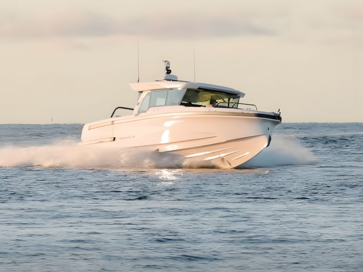 At 11.84 meters long and 3.56 meters wide, it offers more space, especially in the cabins and cockpit, but still keeps the low profile and direct handling of earlier models. The hull is made of GRP and uses Axopar’s twin-stepped, 22-degree V design. It runs on twin outboards, with either 300 or 350 hp each, for a total of up to 700 horsepower. The top speed should be over 45 knots. With an 830-liter fuel tank, the boat is built for longer trips, not just short hops between marinas.