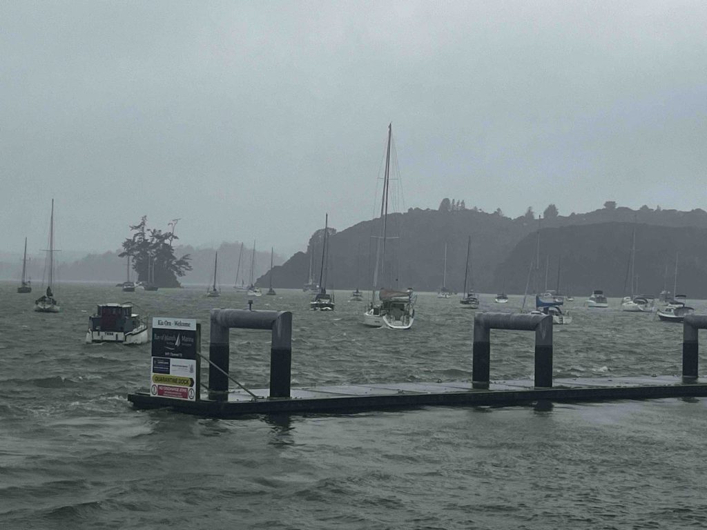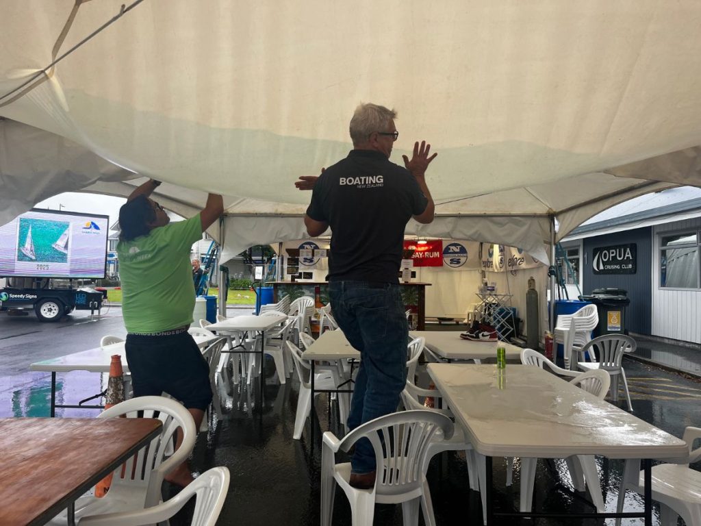 As I stood chatting with Nina and Tony Kiff under the marquee just outside the front door of the Opua Cruising Club, the impact of the rain was impossible to miss. Water streamed across the ground, pooled on the marquee roof, and ran in steady rivulets toward the harbour. I had just jogged from the media shed to the entertainment hut. Five seconds in the open was enough. I was already drenched.