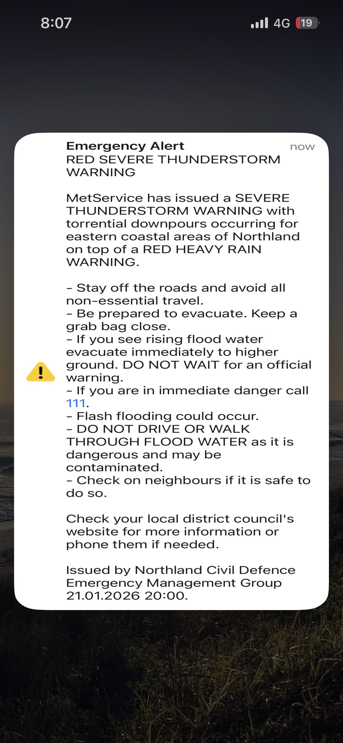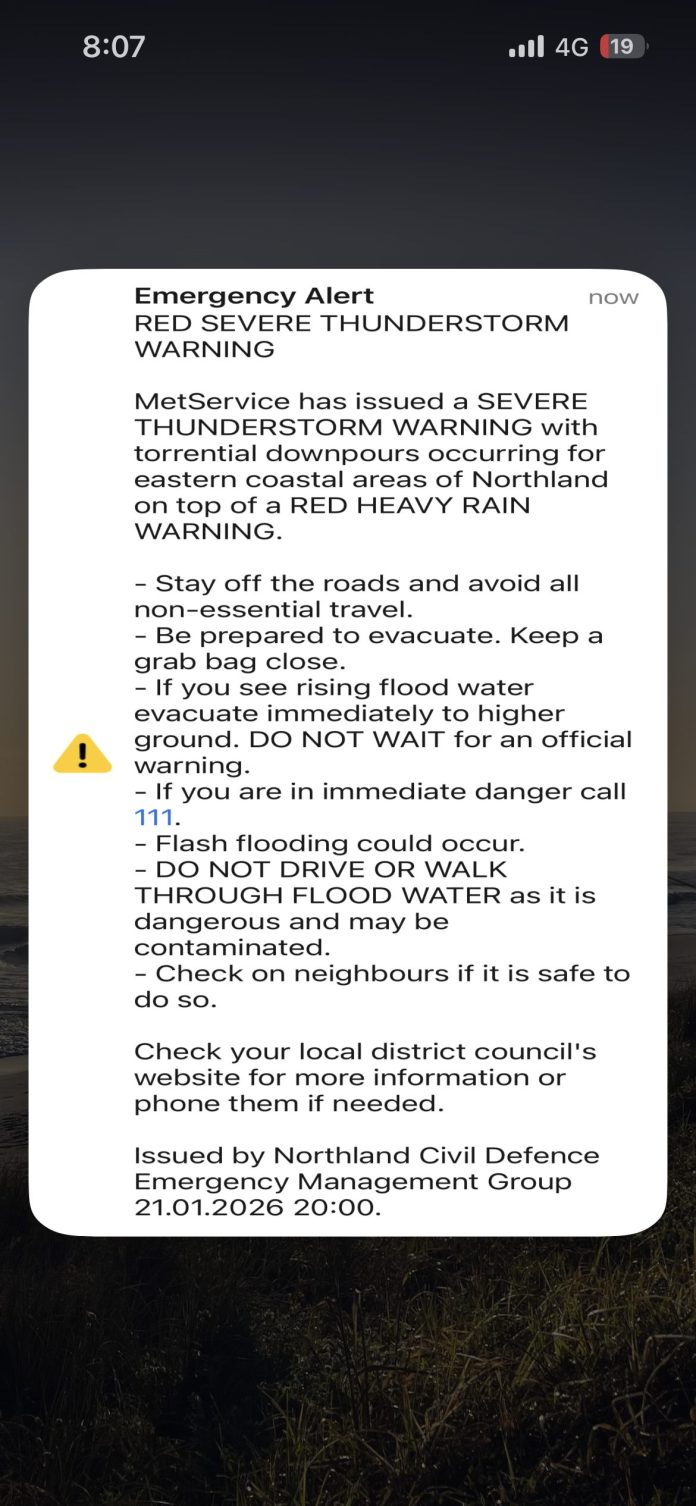 These thunderstorms are accompanied by torrential rain, with peak localised rainfall rates of 25 to 40mm per hour. A red Heavy Rain Warning remains in force for Northland between 8.00pm and 11.00pm, with a further 30 to 50mm expected on top of already significant accumulation.