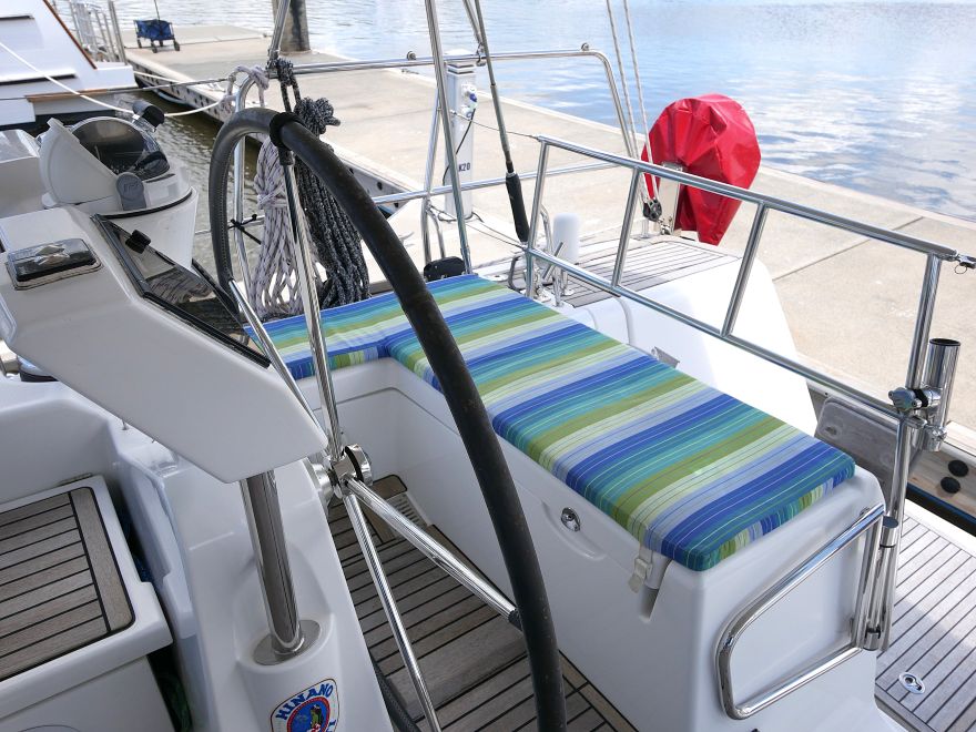 Laissez Faire‘s cockpit is centred around the mainsheet arch, which keeps the traveller clear of the seating area. It is a practical solution. Under sail, it keeps control lines organised. At anchor, it opens up the space.