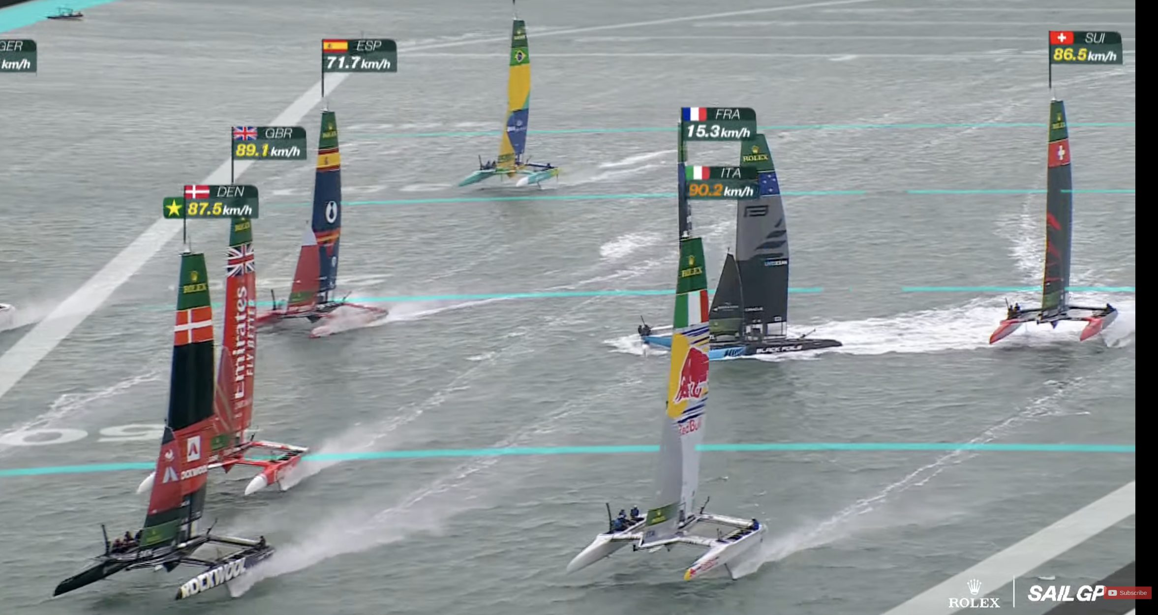 Shortly after the start, France lodged a protest against New Zealand. The umpires penalised the Black Foils for failing to give room. The fleet remained compressed through the next phase of racing, with boats approaching Mark 2 separated by only seconds.