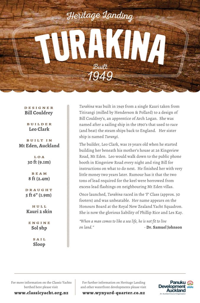 She was built from a single kauri felled in Titirangi and milled by Henderson & Pollard. From the 1940s through to the 1970s, New Zealand saw a generation of yachts built under houses, in garages and in backyard sheds rather than in formal yards. Turakina belongs squarely to that tradition. Soon after the plans were drawn, 19 year old Leo Clark began construction beneath his mother’s house at 26 Kingsview Road, Mt Eden. He built her in double skin kauri, working with little money and plenty of determination. Each evening he would walk to the public phone booth on Kingsview Road to ring Couldrey for advice on what to tackle next. Rumour has it that the two tons of lead required for her keel were sourced from surplus lead flashings from neighbouring Mt Eden villas. True or not, the story fits the era. Two years later she was complete.