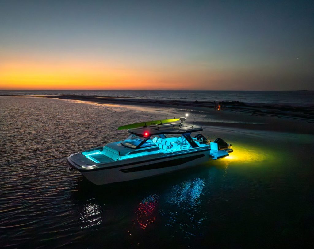 There is an expansive hardtop roof with integrated racks, designed for storing water sports equipment. A concealed aft electrical slide out awning provides extensive shade cover when required. There are also concealed LED lights throughout the vessel which enhance the boat’s stylish stance at night.