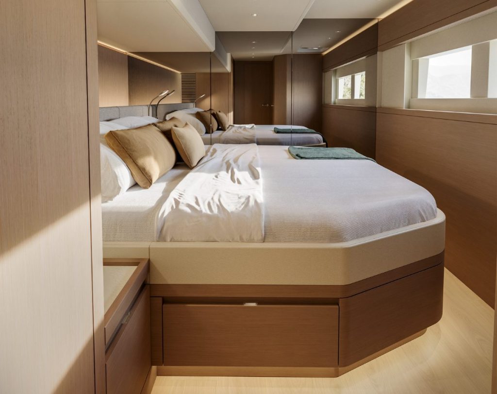 Highlights include a redesigned master cabin and saloon, modular furniture throughout, and a sophisticated ambience characterised by light, space and modern elegance.