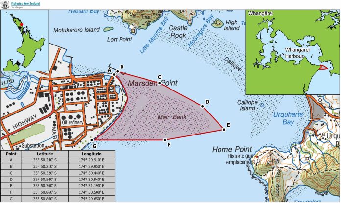 The application has been made by the Patuharakeke Te Iwi Trust Board under Section 186A of the Fisheries Act 1996. The closure would cover approximately 1.46 square kilometres of fisheries waters, bounded by the Marsden Point Marine Terminal jetty and Whangārei Harbour channel buoys 18, 16 and 14.