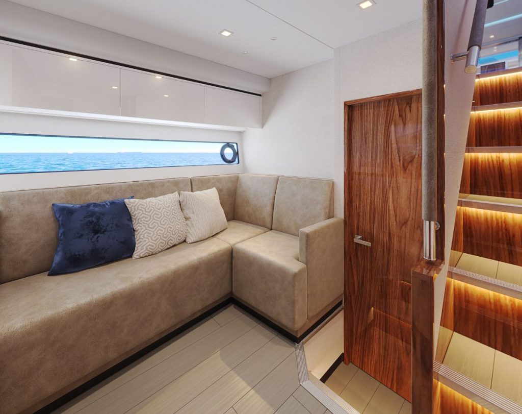 In true motor yacht style, the saloon features a very practical starboard door for quick and easy access from the galley to the forward deck.