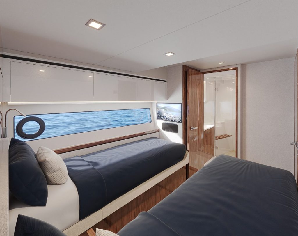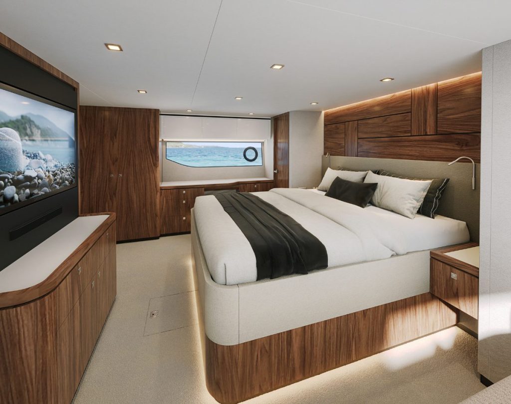 Choose three or four staterooms on the accommodation deck with three ensuite bathrooms and a magnificent full-beam master suite. There’s also a utility room/crew cabin with a dedicated laundry, and a generous tender garage designed to stow all your water sport toys and equipment. The 6200 Sport Yacht has all this and more, plus the practicality of a full-height engine room with excellent access and serviceability.
