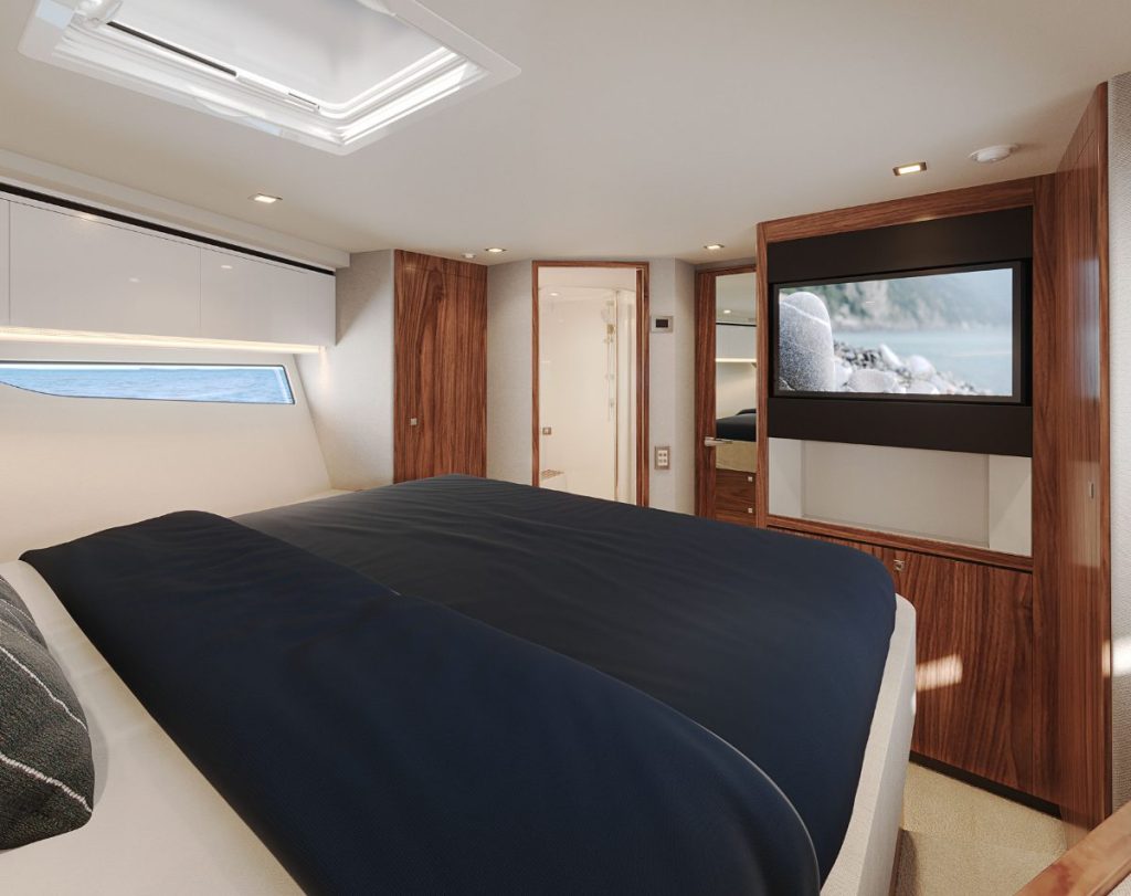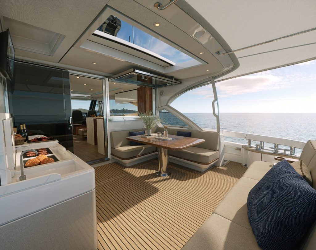 And to take full advantage of magic moments shared on the aft deck, an impressive electric sunroof glides open to invite fresh air, the warmth of the sun or the sparkle of the stars.