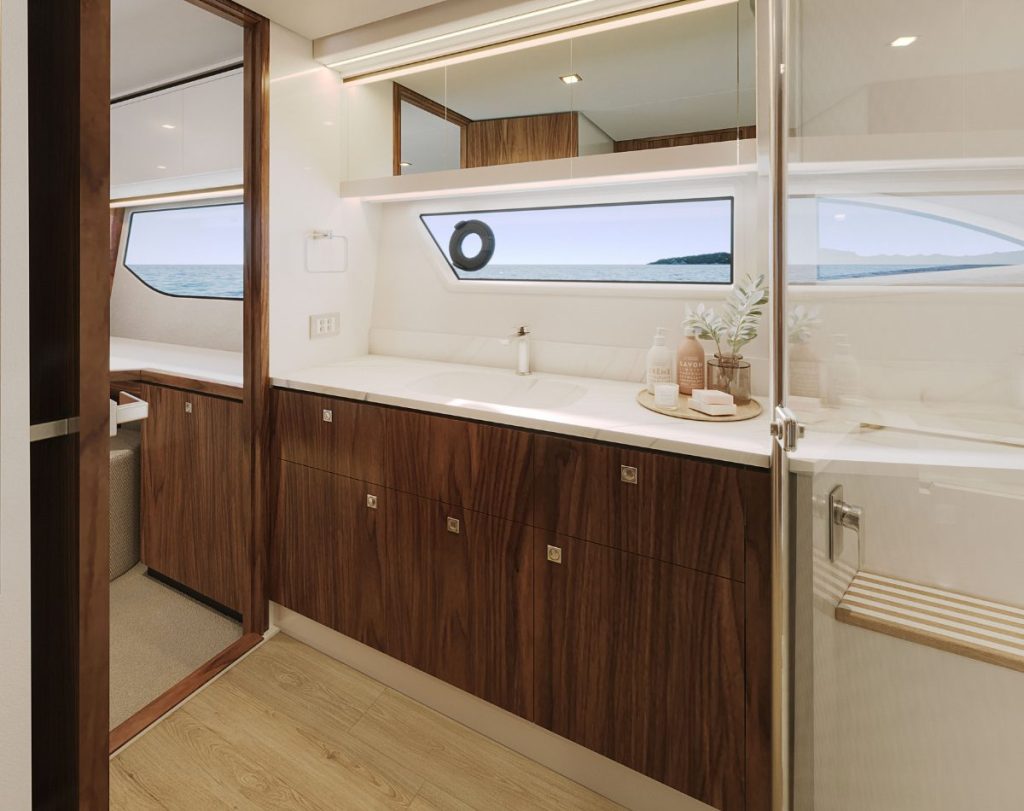 Slide open the saloon door and open the awning window; both are engineered for great strength from tinted toughened glass and framed in polished stainless steel. Now the aft deck flows into the saloon creating one grand living and entertaining space.