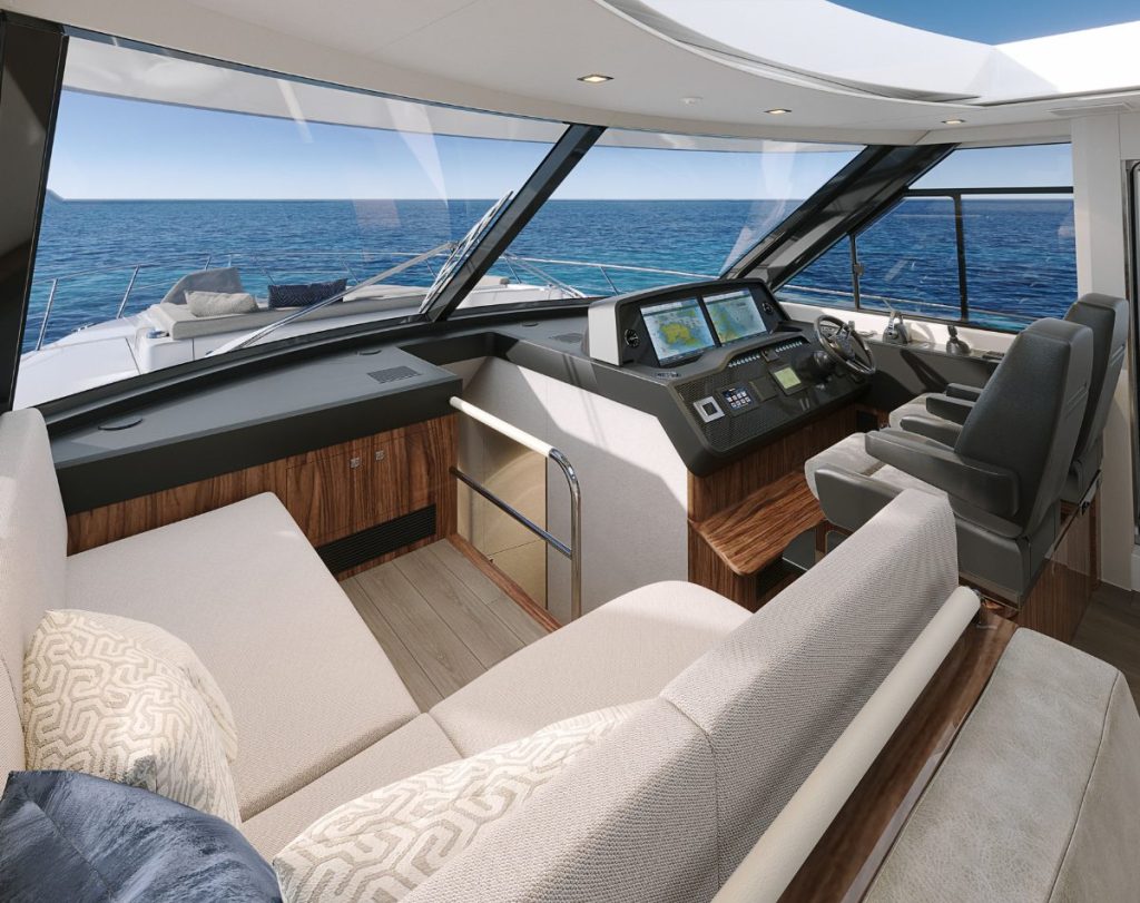 The helm of the 6200 Sport Yacht is state-of-the-art, featuring touch-screen navigation and operation technology designed to make boating easier and more enjoyable.