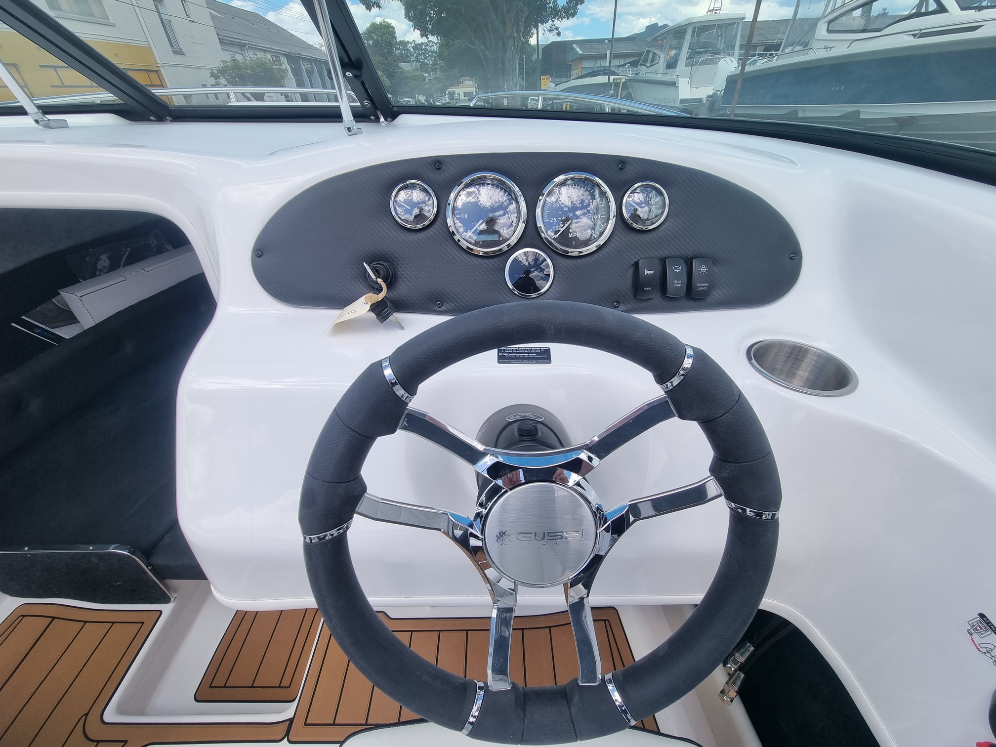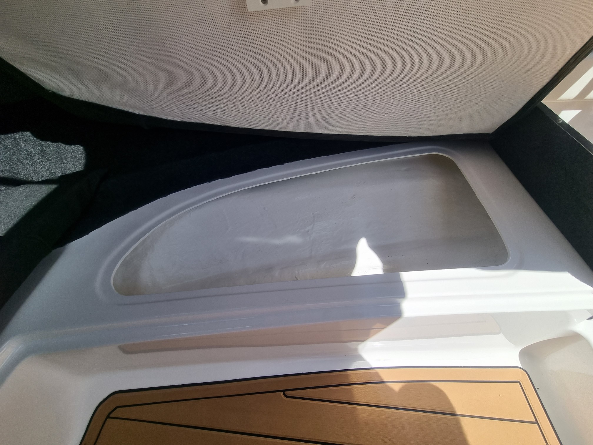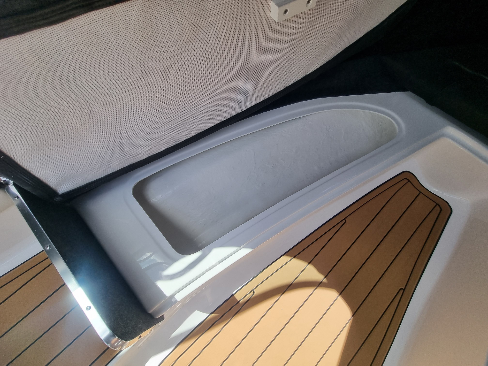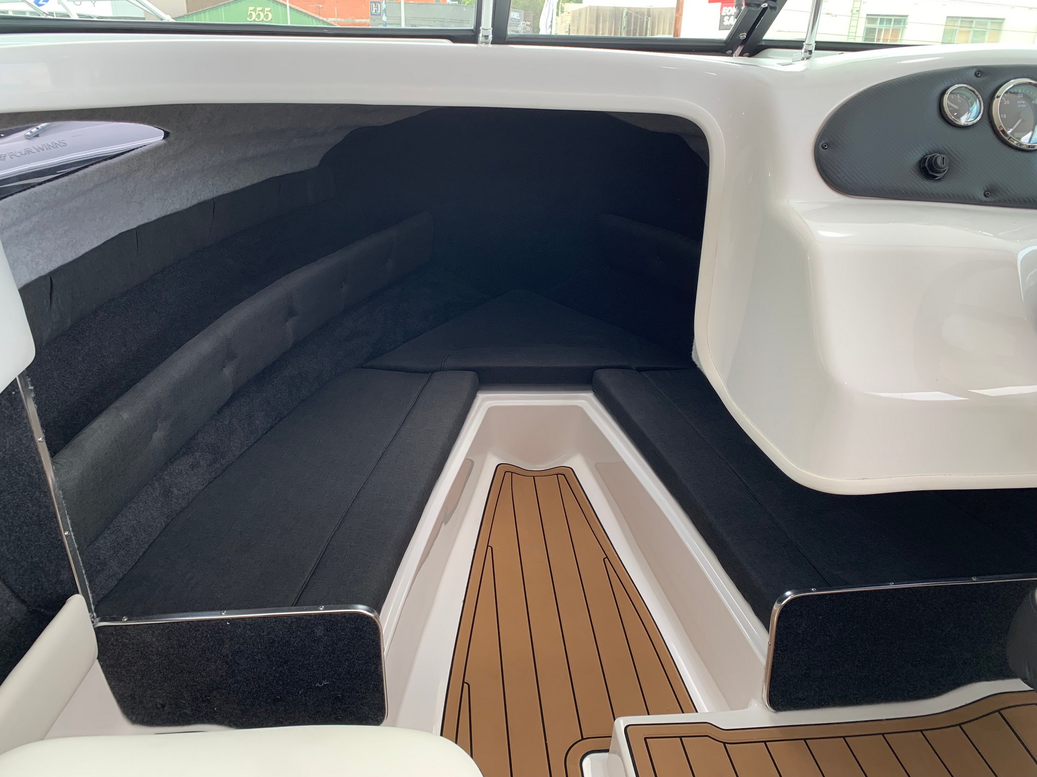 Step aboard, and you’ll be greeted by a meticulously designed interior that exudes opulence and practicality. Comfortably seating six, you will be greeted with a Seadek floor and a spacious V-berth cabin, providing a generous and comfortable space for you and your companions.