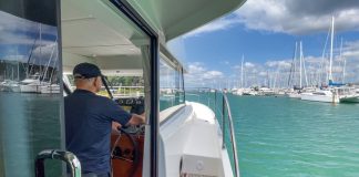 We’re parking the Absolute 47 back on her Westhaven berth in a 18-knot breeze. The fairway looks awf...