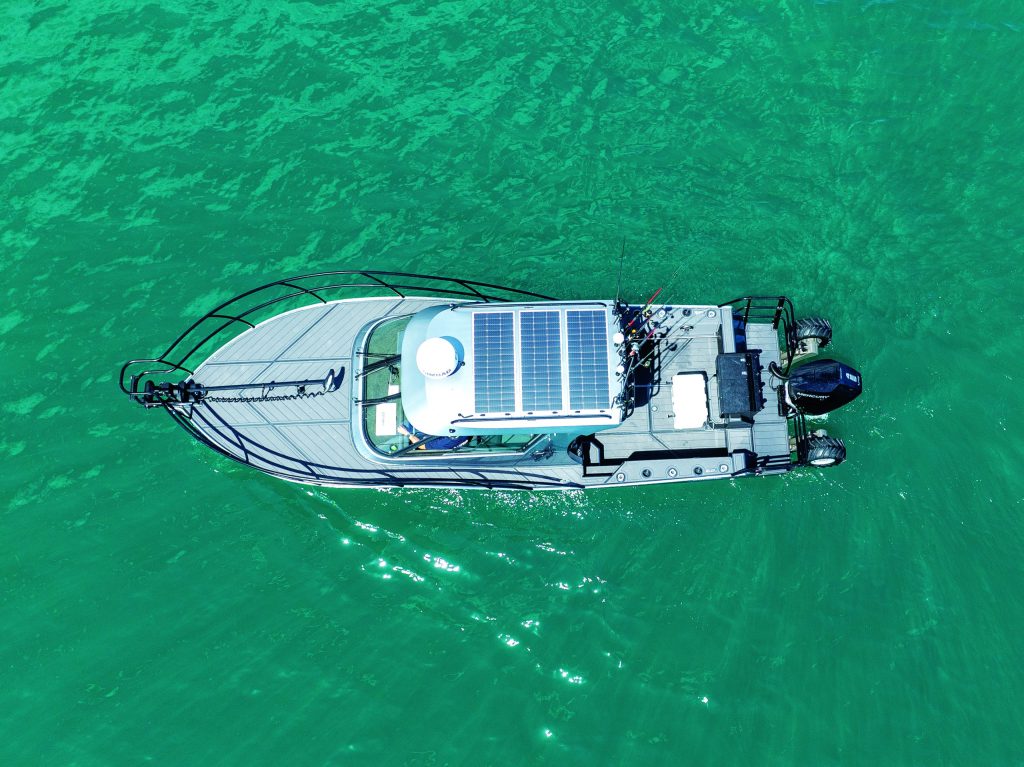 on the bow, and the 12-volt engine and house demands. A DC-DC regulator takes care of the voltage step-ups and step-downs, with the tidy, neatly labelled installation visible inside the transom locker. The Mercury’s high output, 150-amp alternator easily keeps up with charging demands, supplemented by solar panels covering most of the hardtop roof.