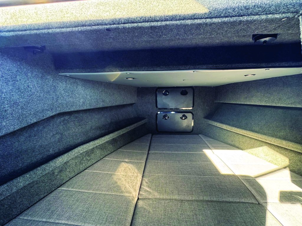A Viper Pro-Series drum winch takes care of anchor duties. Gas rams extend the fairlead/bowsprit so the anchor clears the wheels; the Viper winch pulls it back inboard when the anchor is all the way up. With this arrangement there’s no need for an extended bowsprit, and the Minn Kota also needn’t stick out so far to clear the anchor. The upshot is a shorter boat that’s easier to garage. Clever.