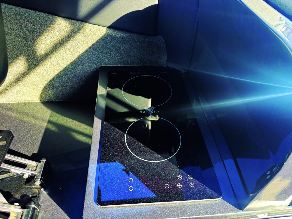 Once aboard, the vessel feels spacious inside, and premium too, with ample cockpit area, two-metre-plus standing headroom under the hardtop, a two-element induction cooktop (no LPG or flames onboard), fridge, dinette, plenty of undercover seating options, and a large forward cabin with a generous berth and a flush toilet. It’s comfortable for long days on the water chasing game fish, family cruising, or for the occasional overnighter.
