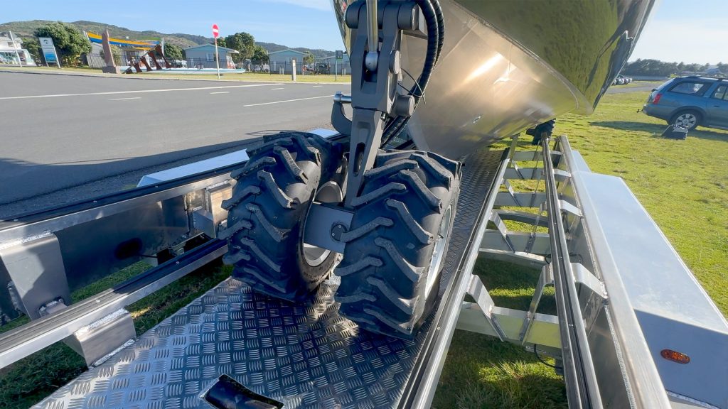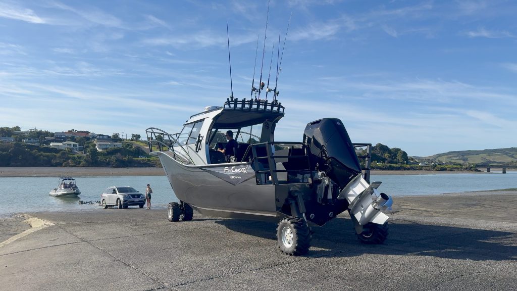 Large the Fin Chaser 800HTWA might be, but its ease of use belies its bulk, one of the biggest attractions of amphibious vessels. This was illustrated by the way Fin Chaser’s Tim Fairhurst (aka ‘Timmo the Fisho’ – check out his YouTube channel) singlehandedly unloaded the boat from its custom road trailer beside Raglan Harbour after towing it from Hamilton. He simply climbed aboard, raised the boat up on its wheels, and near-silently reversed it off the bespoke, triple-axle Credo-braked trailer.