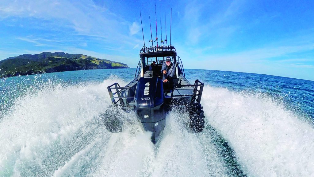 The Mercury 425hp V10 is a beast, offering impressive hole shots and 40-knots plus top speed, but the boat was rushed out of the factory for this review, so Max Christensen expects further improvements to top speed, fuel economy and handling with a bit of fine tuning. A Seakeeper Ride active trim tab system is integrated into the transom in recessed pockets, an engineering first for an aluminium boat in New Zealand. It seamlessly controls pitch and roll.
