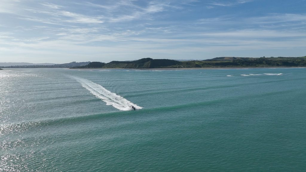 The wind had died away to almost nothing and the seas had flattened off for our journey back to Raglan, which was pleasant in warm, sunny conditions – sliding side windows welcome. The boat cruises comfortably anywhere between 20 and 30 knots and we achieved a top speed of over 40 knots. Closer to the coast, we spent a bit of time performing manoeuvres for the drone camera, before tackling the bar once more and cruising back up the harbour to our launch position.