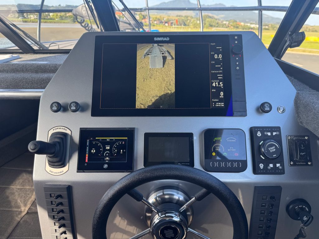 The electronics on this vessel are comprehensive. A 16-inch Simrad NS 4 MFD displays sonar, Radar and GPS, along with Simrad autopilot, a full suite of Mercury engine data and the video feed form the bow camera, necessary to show the way ahead over the high bow when operating on land.