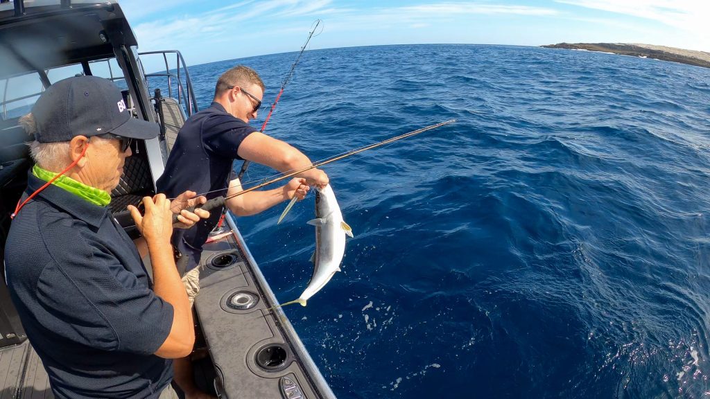 The powerful through-hull transducer gave a good, clean bottom reading at 28 knots and Tim used the sonar to good effect to locate schools of kingfish patrolling the reefs around the island. Jigging produced a succession of small kingfish, which were entertaining to catch and release, though to beat the sharks, you had get them to the boat quickly! Some bronze whalers even shadowed topwater lures cast from the bow platform. Tossing a soft plastic around resulted in a reasonable snapper and a nice trevally, destined for sashimi, along with more small kingfish. The snapper and trevally were consigned to the large livewell low in the hull amidships, a feature found throughout the Fin Chaser range.