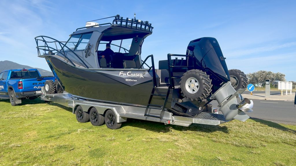 Leaving the water was just as effortless as entering it had been, Tim skilfully piloting the big rig around other boats on the ramp preparing to launch. The sight of a boat exiting the water on its own wheels always draws attention, but the imposing Fin Chaser 800HTWA pulled a bigger crowd than most. By the time Tim drove the boat along the access road and onto its trailer, there was quite an audience, and within minutes of leaving the water, the big Fin Chaser was safe and secure on its road trailer, its systems shut down, ready to head back to Hamilton.