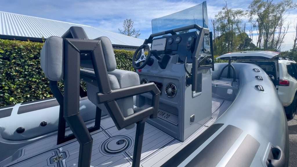 The centre console has a tall windscreen that provides plenty of protection and there is no shortage of handholds. A sturdy aluminium handrail frame straddles the console, and two long vertical handholds are mounted on either side of the front. Both sides of the bow section of the Hypalon tube have three handholds, plus a stern, middle, and bow handhold outboard on the tube on each side.