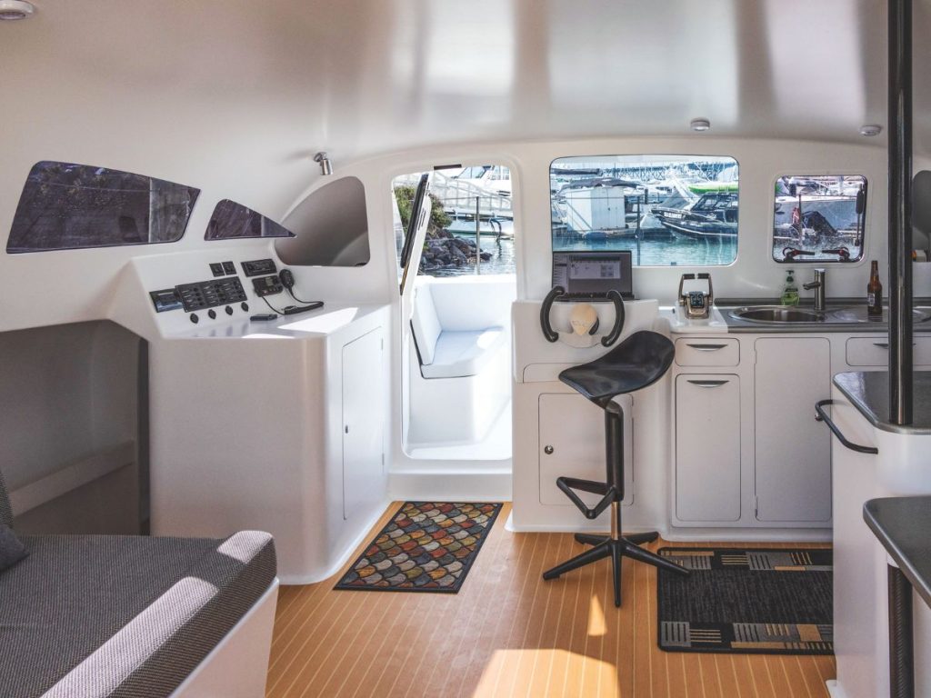 Visibility from the helm station is unparalleled. As is quick access to either the for’ard cockpit and foredeck, or the aft cockpit and boarding steps. A small inflatable dinghy sits snug and unobtrusively from elegantly simple davits. It has an electric outboard, natch, and will soon have an even better one, employing a clever horizontal push configuration that John’s developing.