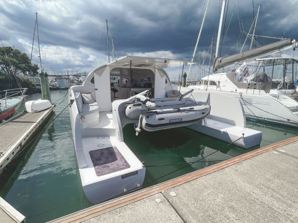 The E-40 PowerCat is the latest in a long line of engineering and boating innovations by John McGettigan Earthling’s creator and owner. New Zealand boaties mightl well remember John’s previous iconoclastic boat, the so-powerful-it-was almost-unearthly sailing catamaran Earthling with its towering rig, automated leach control and distinctive silver-gold livery.