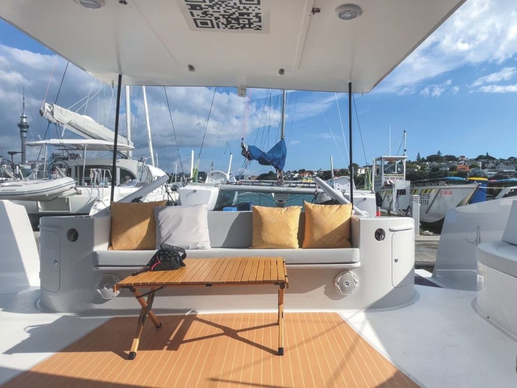 A quick tour of layout and accommodation. Earthling is notable for its single-level, flow-through layout. A doorway just by the helm station leads to a for’ard cockpit. In good weather conditions (as on our photo outing in the upper Waitemata Harbour), this door stays open, providing a fine through-flow of fresh air. I don’t know much about these things, but I imagine this amounts to fine maritime feng-shui.