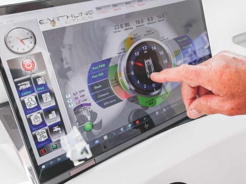 John’s over-riding concept for the E-Thos system is “operation by exception.” Meaning, you don’t need to worry about the complexities of the boat, or continually have to peer under the bonnet. The touchscreen will let you know immediately with visually-targeted alarms if ever a need arises. Otherwise, says John, “you don’t have to stress about anything.”