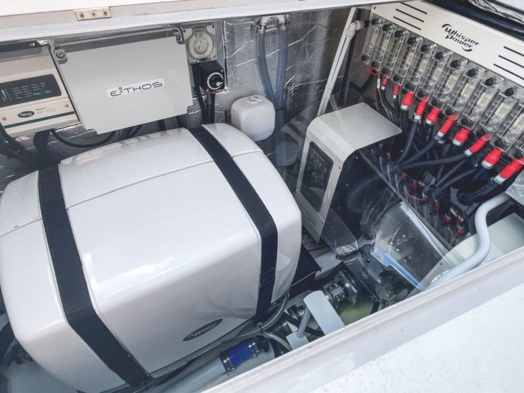 He demonstrated how he can start up the generators remotely – if the system tells him via smartphone, that some re-charging is necessary. Without the boat underway, the Whisperpower generators are still quiet. Like the almost inaudible sound of a sewing machine, indoors at your neighbours, two doors away.