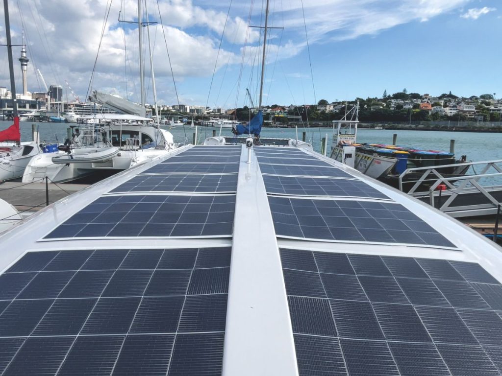 The extraordinary efficiency of Earthling as a cruising launch is due to her fine hulls based on the Stealth 36 powercat, designed by Aussie Alan Carwardine and built in Phuket, Thailand. To help things along, John sent the Thai builders highly-detailed 3D digital modelling for various customised aspects of the E-40. Built with core composite foam and carbon fibre inserts, the extended 12m cat weighs only 3.6 tonnes. John had intended fitting the systems in Phuket before shipping the boat to Europe, however Covid intervened and the empty hull was instead shipped to Auckland for the fit-out.