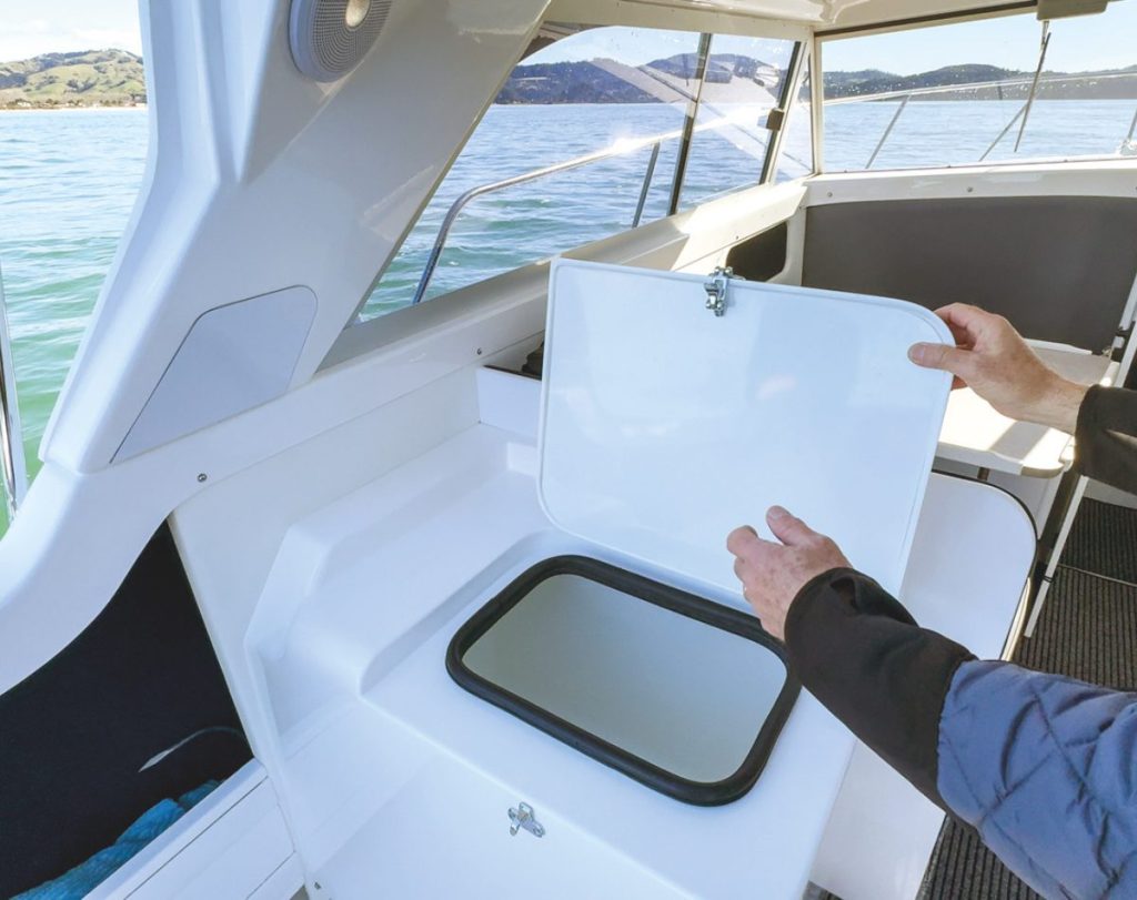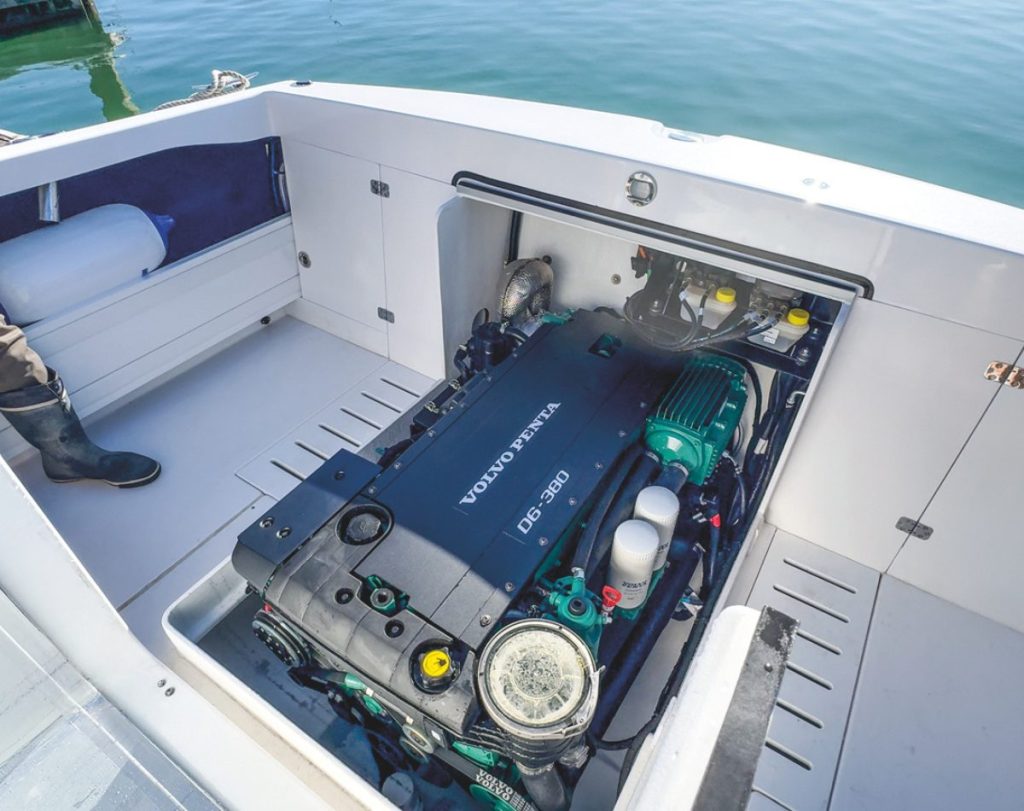 John Booker of Pacific Coast Marine, based in Whitianga, was given the brief: Turn the Caribbean 27 into a “Kiwi fishing boat”. He supplied and installed a single Volvo Penta D6-380 diesel engine with an integrated DPI Aquamatic DuoProp sterndrive. A sterndrive is an ideal solution for a boat that is being hauled out after every use, since the drive can be tilted out the way before the boat is hauled and maintenance is easy on a trailer. The Volvo solution adds electronic vessel control and electronic shift and throttle to a solid and robust engine design. In addition, the totally integrated Volvo package is also very compact which made for a clean install.