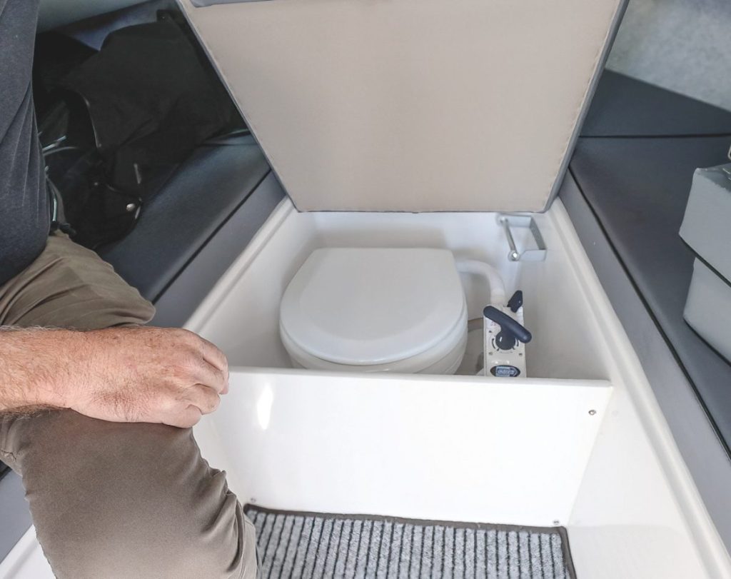 Accommodation comprises a huge berth in the forward cabin with infills to make a triple berth, while the dinette table on the port side of the main saloon converts to another berth. There’s a toilet hidden under the centre squab in the main cabin. On the starboard side of the saloon is a galley with sink, under-seat fridge and provision for a small gas or diesel cooker.
