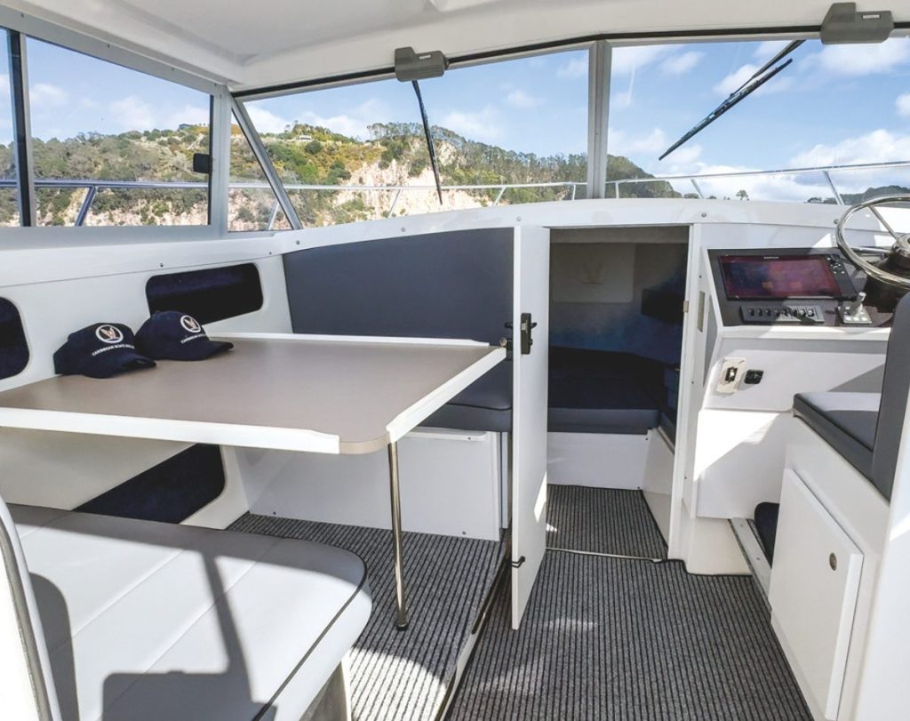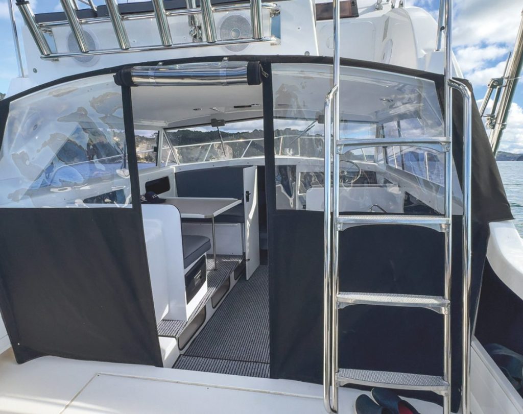 The cabin is spacious and comfortable, and although the sportfisher configuration has an open backed cabin, this can be fully enclosed with the factory supplied canvas bulkhead with zip door and clear windows. The flybridge is also completely open with just a bimini top but factory-supplied all -round clears are an option. The front windscreens are Armourglass, for peace of mind when things turn rough.