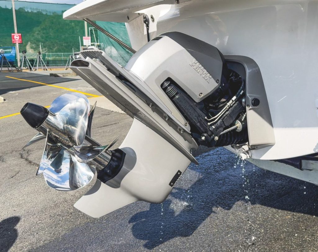 The engine compartment required a few modifications to accommodate engine dimensions that were different from the factory default. The Volvo was fitted with a short tail housing to reduce its length. Changes to the engine box covering were made, with a 100mm upstand built around the engine box. This box also has an integrated lip drain to make sure no water can get into the engine compartment no matter how much of it splashes around the cockpit. The engine installation allows plenty of space to get all around the motor, while all maintenance items are accessible from the top.