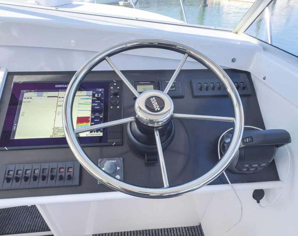 The electric steering wheel can be tilted up and down, something that very few hydraulic systems offer, and the digital shift and throttle controls are super light to use. Controls for the Zipwake trim system, as well and the SidePower bow thruster, complete the helm layout. Simrad electronics, Zipwake and Sidepower components were all supplied by Advanced Trident Ltd.
