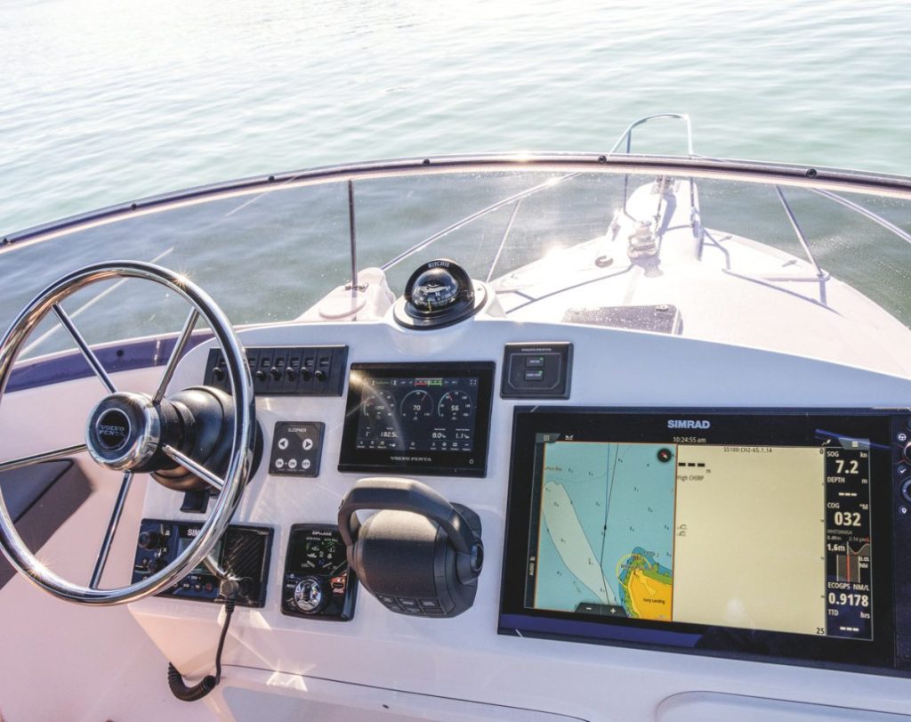 Both the main helm and flybridge have very similar electronics configurations, each with a large Simrad multifunction display taking care of chart-plotter, fish finder and autopilot management duties. Of course, for game fishing those Simrad MFDs have been upspec’d with a 3kW transducer, which also provides all the latest down and side imaging options. The Volvo engine has its own digital gauges, but of course the engine parameters are also available on the Simrad.
