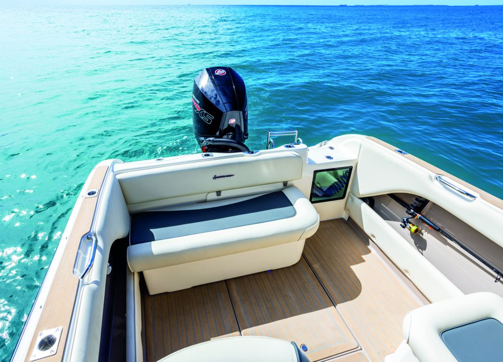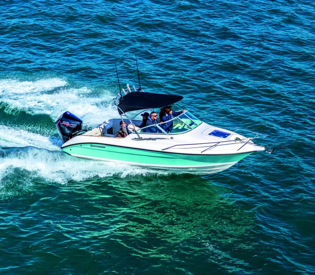 Changes to the new model are subtle but significant. They include, among others, modifications to the deck, cabin and liner mouldings, the transom arrangement, and seating. In this latest iteration of the 605, Buccaneer has incorporated several features from other models in its range, including the port locker from the 615/575 and larger seat bases with more storage, which means that this is the first 605 fitted with an optional fridge. The seating option is also new—off-the-shelf, forward-facing swivelling Captain’s seats with bolsters, and lower, rear-facing seats with storage under the bases. Pedestal seats are also offered.