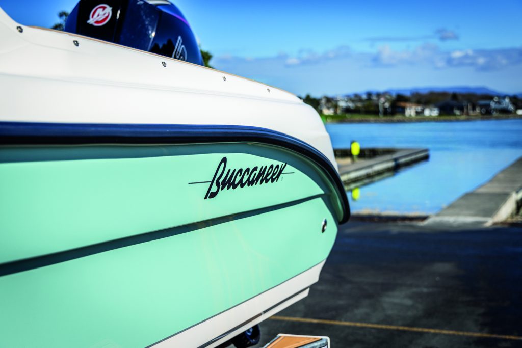 The latest developments are embodied in this boat; a new Buccaneer 605 Exeed, this one featuring a fresh new colour scheme with attractive seafoam green gelcoat sides. It rides on a stylish Enduro dual-axle override-braked trailer with colour-coordinated mudguards and alloy wheels, contributing to a visually appealing and well-integrated package.