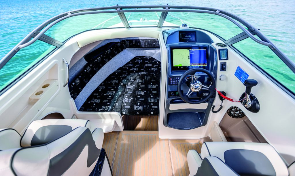 The 605’s new dashboard now has room for a 16-inch MFD, in this case a premium Garmin unit, with space left over for a new switch panel by Loom-A-Tech—you can change the colours on it, and it’s Bluetooth compatible—a GME VHF radio and Fusion stereo (speakers tucked in forward under the gunwales) and a USB outlet. Other controls and switches (capstan, rotary control for the new indicator panel above the main display) are arranged alongside the new moulded dashboard.