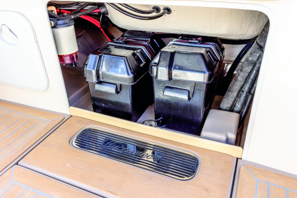 The transom has been updated with a separate locker for the battery switches, plus incidental storage, and a hinged fibreglass panel on compression latches protecting the floor-mounted batteries, one house and one start. This replaces the old domed vinyl curtain from the previous model. The bait tank on the port side also gets an upgrade with a large window inboard to easily monitor live bait health. The washdown hose also attaches to the pump outlet inside the bait tank.