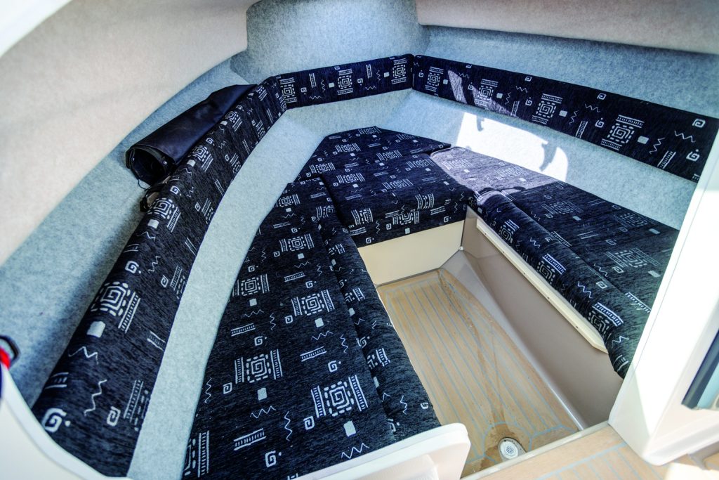 A premium option fitted to the review boat is the Flexiteek used on the cockpit sole and coamings. While more expensive than closed-cell foam floor coverings, Flexiteek is longer lasting and more hard-wearing. It should last the life of the boat, says Buccaneer Boat’s Wade Gerrand, and if it gets marked or dirty over time, it can be sanded back just like real teak. The review boat featured Flexiteek (bleach/grey) the colour of pale sand, which went very nicely with the boat’s colour scheme inside—different shades of grey, tan, and white gelcoat and vinyl upholstery and trim in the cockpit with black and gold fabric used in the front cabin.