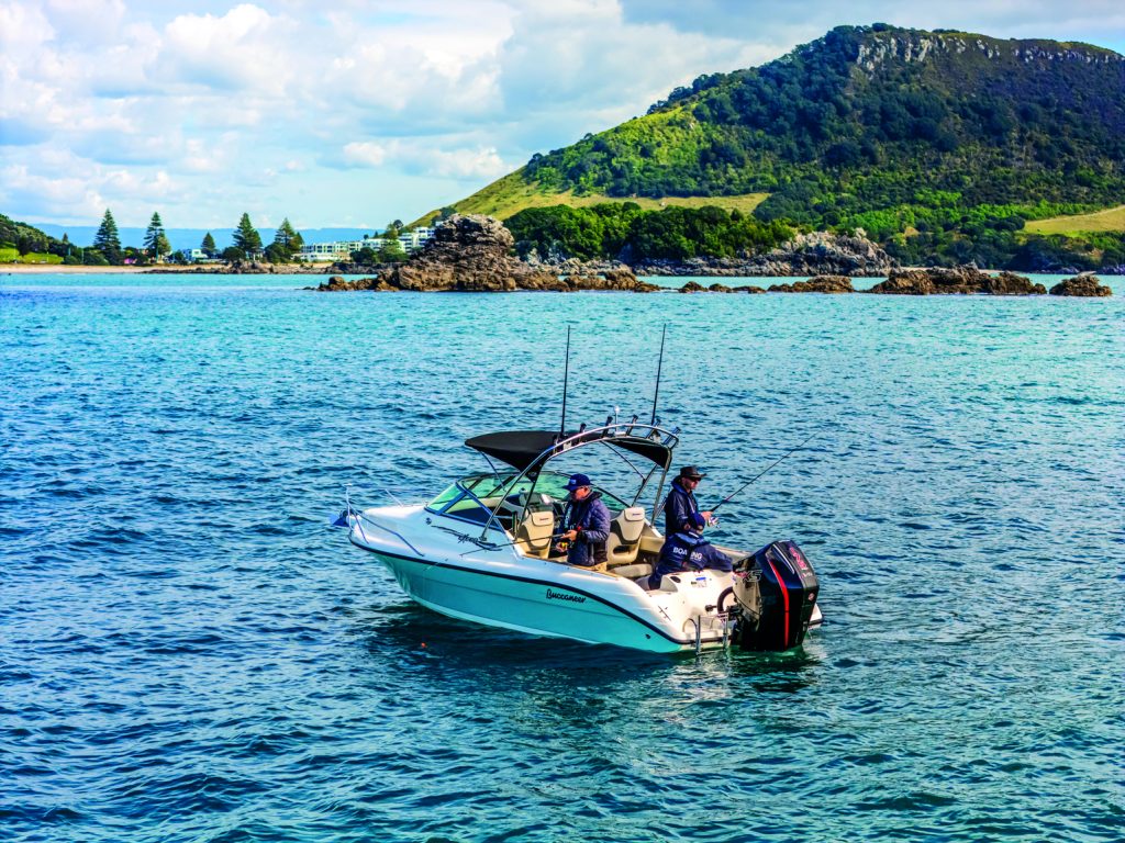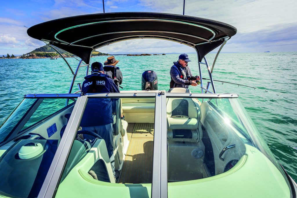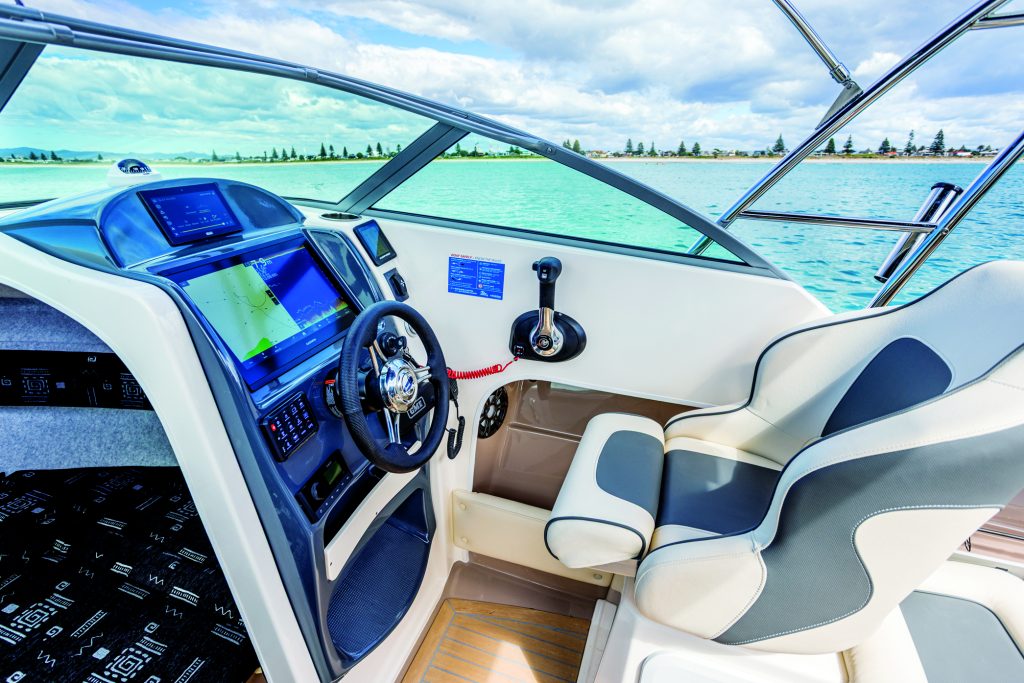 A notable highlight of this model is the introduction of the new Humphree Lightning trim system (see sidebar), which promises handling benefits and ease of use. This is the first such system fitted to a New Zealand-built boat, and it was still undergoing fine-tuning, but it delivered a seamless driving experience, taking away any need to adjust engine trim when underway or fiddle with trim tabs to compensate for sea conditions, boat loading, or passenger movements onboard. Operating in automatic mode, it delivered
