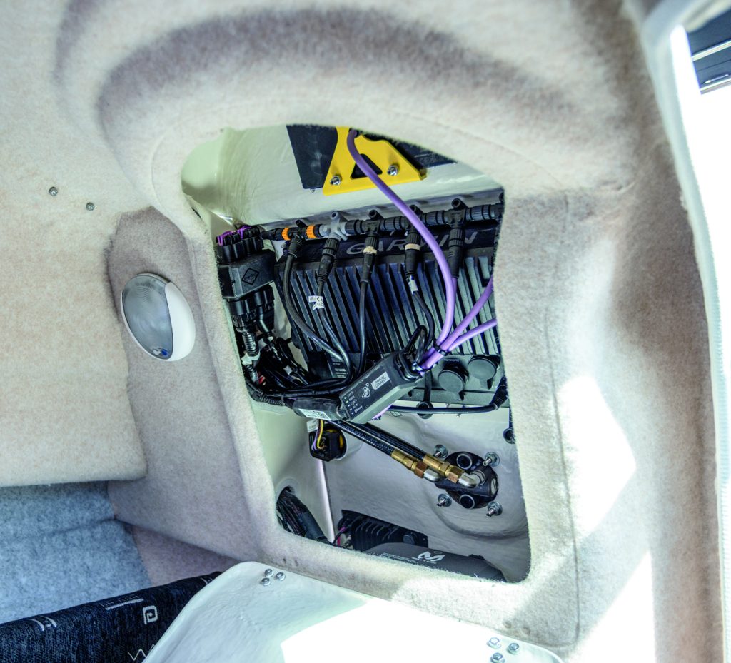 The helm area is really very tidy with everything nice and easy to reach, seated or standing, an adjustable helm seat, moulded footrest and good vision from the helm. The wiring looms by Loom-A-Tech are customised so the setup behind the dashboard is very neat and tidy, with a moulded cover that drops down for a clean appearance. This vessel features LED cockpit lights, including a floodlight, LED transom lights, and underwater lights.