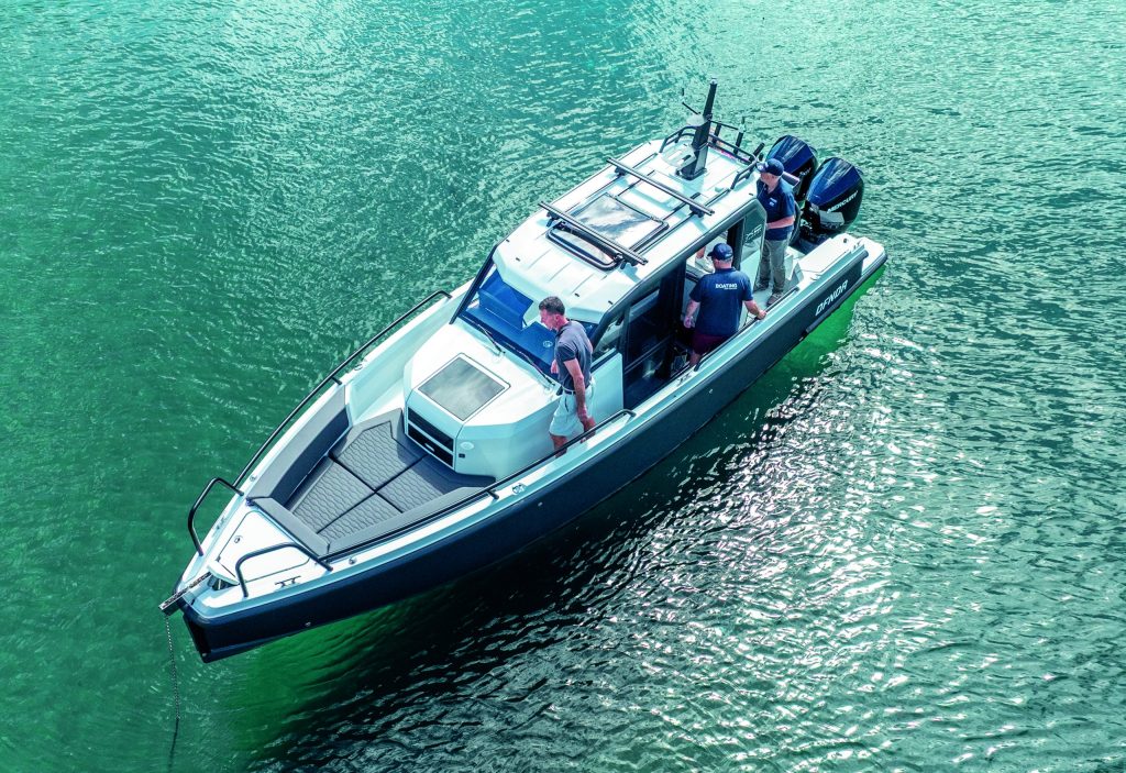 Once we’d crossed the bar, we headed up the coast at a comfortable 28–32 knots, burning about 33 litres per hour per engine at just under 4,000rpm. Throttle response is excellent, there’s minimal bow rise getting onto the plane, and the hull is soft-riding and dry.