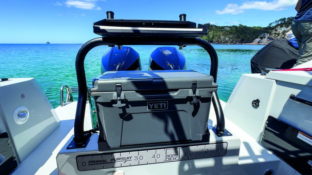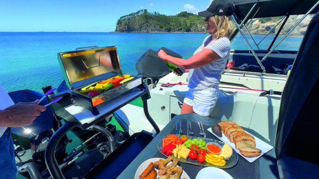 There’s a drop-in cockpit table for entertaining or eating, while the bait station also supports a portable BBQ or a canister gas cooker. Alternatively, remove the bait station and chilly bin altogether and slot in the custom transom seat (a standard factory transom seat is also available). A hot water cylinder feeds the cockpit shower – great for washing off the salt after a swim, warm up after a dive, or freshening up after a day onboard.